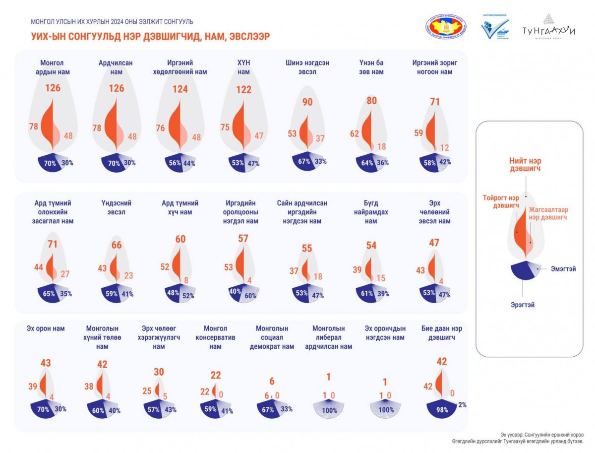 СОНГУУЛЬ -2024: УИХ-ын сонгуульд нэр дэвшигчдийн 61 хувь нь эрэгтэй, 39 хувь нь эмэгтэй