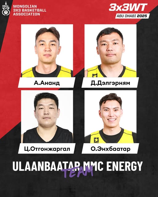 Сагсан бөмбөгийн “FIBA 3x3 Abu Dhabi World Tour” тэмцээн 2025 оны аравдугаар сарын 25-ны өдөр эхэлнэ. Тус дэлхийн цуврал тэмцээнд “Ulaanbaatar MMC Energy” баг тоглоно. Манай багийн бүрэлдэхүүнд А.Ананд, Д.Дэлгэрням,О.Энхбаатар, Ц.Отгонжаргал нар байна. “Ulaanbaatar MMC Energy” баг хэсгийн шатны эхний тоглолтоо аравдугаар сарын 25-ны өдөр 22:40 цагаас Францын “Toulouse” багийн эсрэг хийнэ.
