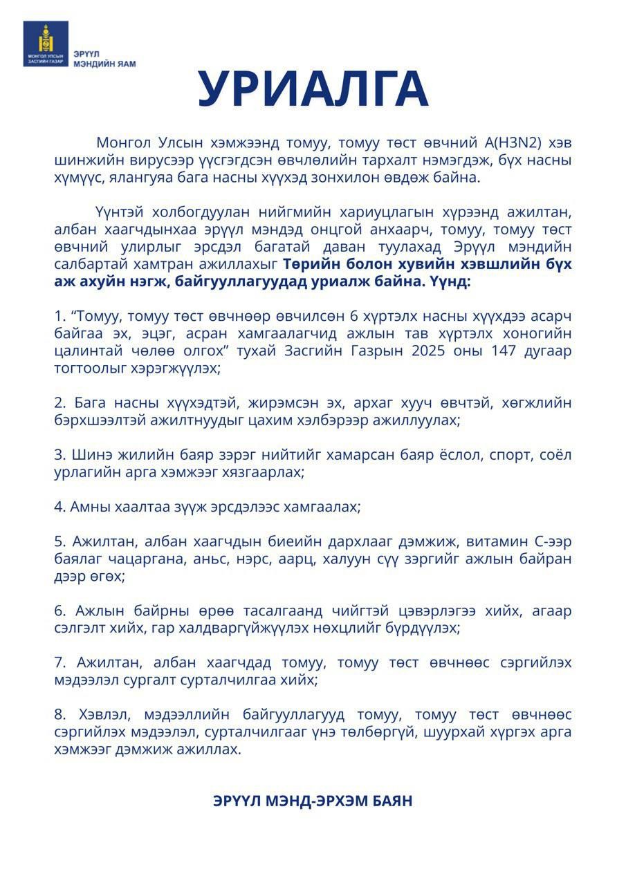 Эрүүл мэндийн яамнаас томуу, томуу төст өвчний улирлыг эрсдэл багатай даван туулахад төрийн болон хувийн хэвшлийн бүх аж ахуйн нэгж, байгууллагуудад хамтран ажиллах дараах уриалгыг дэвшүүлжээ. Үүнд: