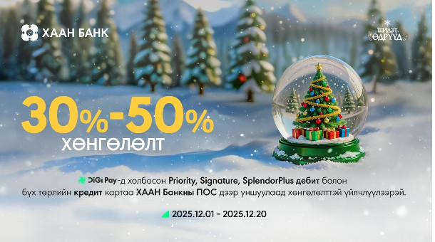 ХААН Банкны Priority, Signature, SplendorPlus дебит карт болон бүх төрлийн кредит карт эзэмшигчид 2025 оны 12-р сарын 1-ээс 12-р сарын 20-ны өдрийг дуустал ЭНД буй сонгогдсон байгууллагуудад худалдан авалт хийхдээ 30-50 хувийн хөнгөлөлт эдлэх боломжтой боллоо. Урамшуулалд хамрагдахын тулд эдгээр картуудаа ХААН Банкны Digi Pay аппликэйшнд холбоод, ХААН Банкны ПОС төхөөрөмжид уншуулаарай.