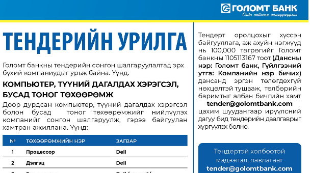 Голомт банк: ТЕНДЕРИЙН УРИЛГА