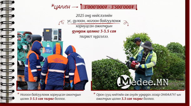 Нийслэлээс 2025 онд ногоон байгууламж хариуцсан ажилчдын цалинг 3-3.5 сая төгрөг, Орон сууц нийтийн аж ахуйн удирдах газар ОНӨААТҮГ-ын ажилчдын дундаж цалинг 3.3 сая төгрөг болгож нэмэгдүүлжээ.