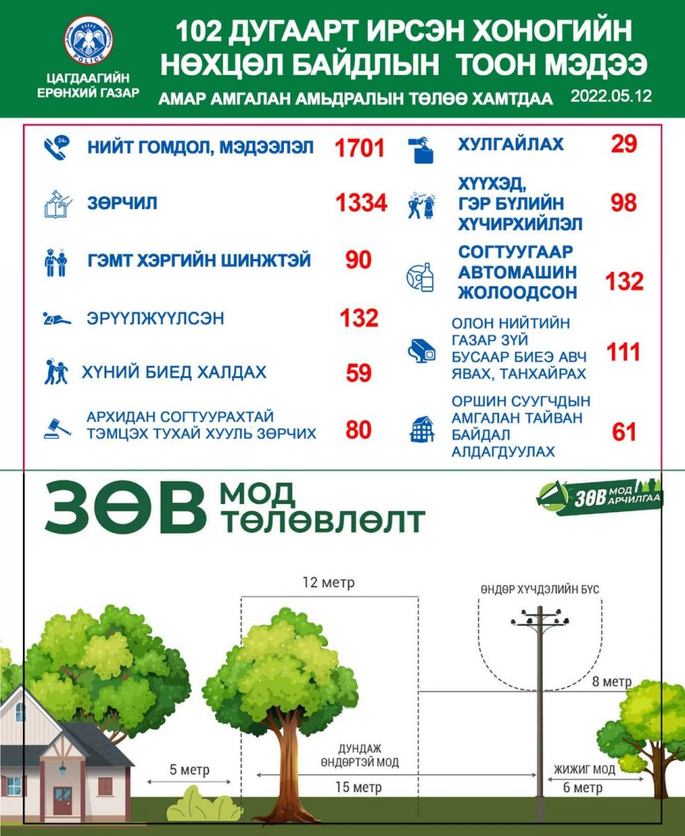 Энэ сарын 12-нд буюу өчигдөр цагдаагийн байгууллагын 102 дугаарын утсанд нийт 1701 гомдол мэдээлэл бүртгэгджээ. Үүнээс зөрчлийн дуудлага мэдээлэл 1334, хулгайтай холбоотой 29, хүүхэд, гэр бүлийн хүчирхийллийн дуудлага 98, гэмт хэргийн шинжтэй 90 мэдээлэл бүртгэгдсэн байна.