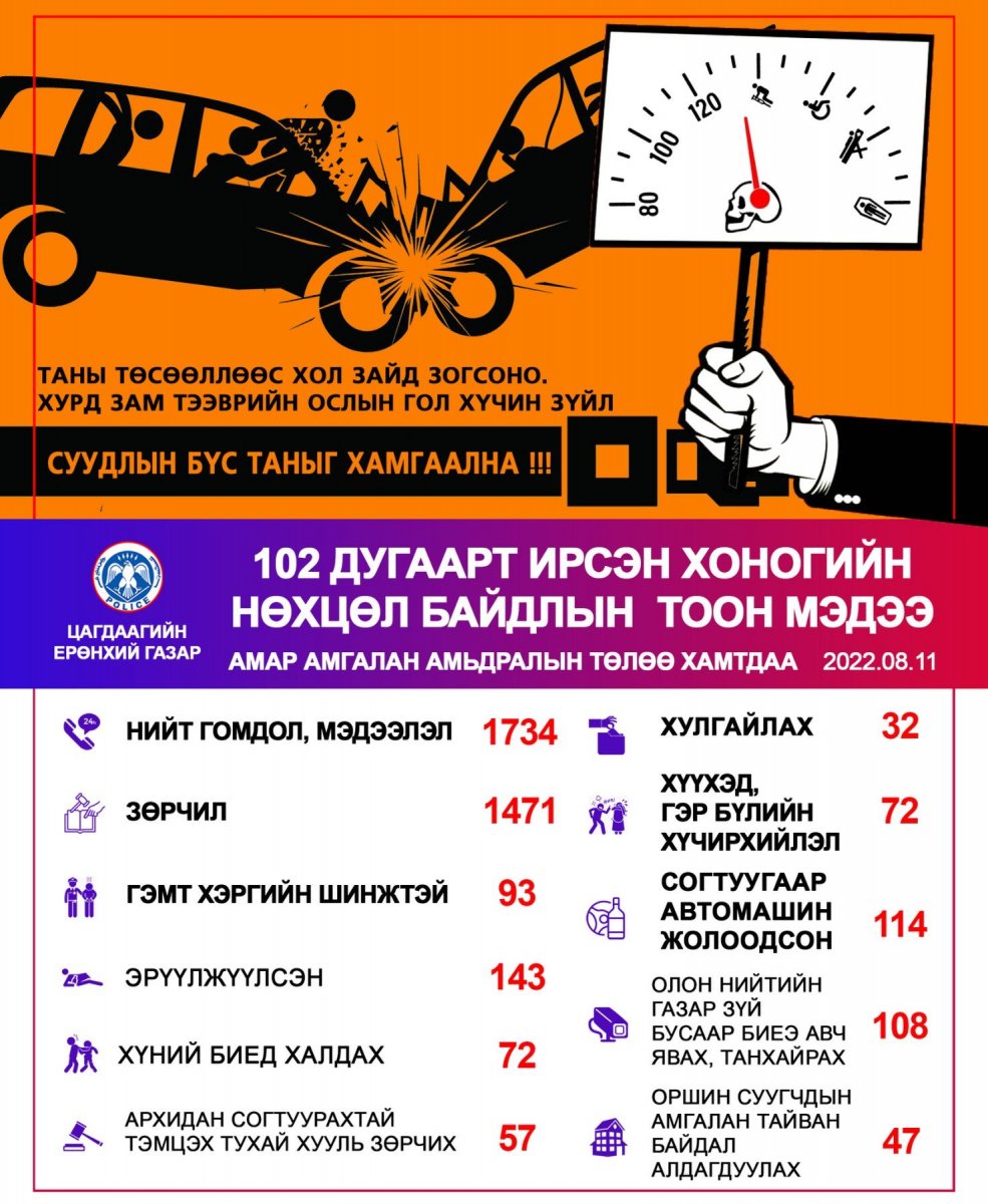 Энэ сарын 01-нд буюу өчигдөр цагдаагийн байгууллагын 102 дугаарын утсанд нийт 1734 гомдол мэдээлэл бүртгэгджээ. Үүнээс зөрчлийн дуудлага мэдээлэл 1471, хулгайтай холбоотой 32, хүүхэд, гэр бүлийн хүчирхийллийн дуудлага 72, гэмт хэргийн шинжтэй 93 мэдээлэл бүртгэгдсэн байна.