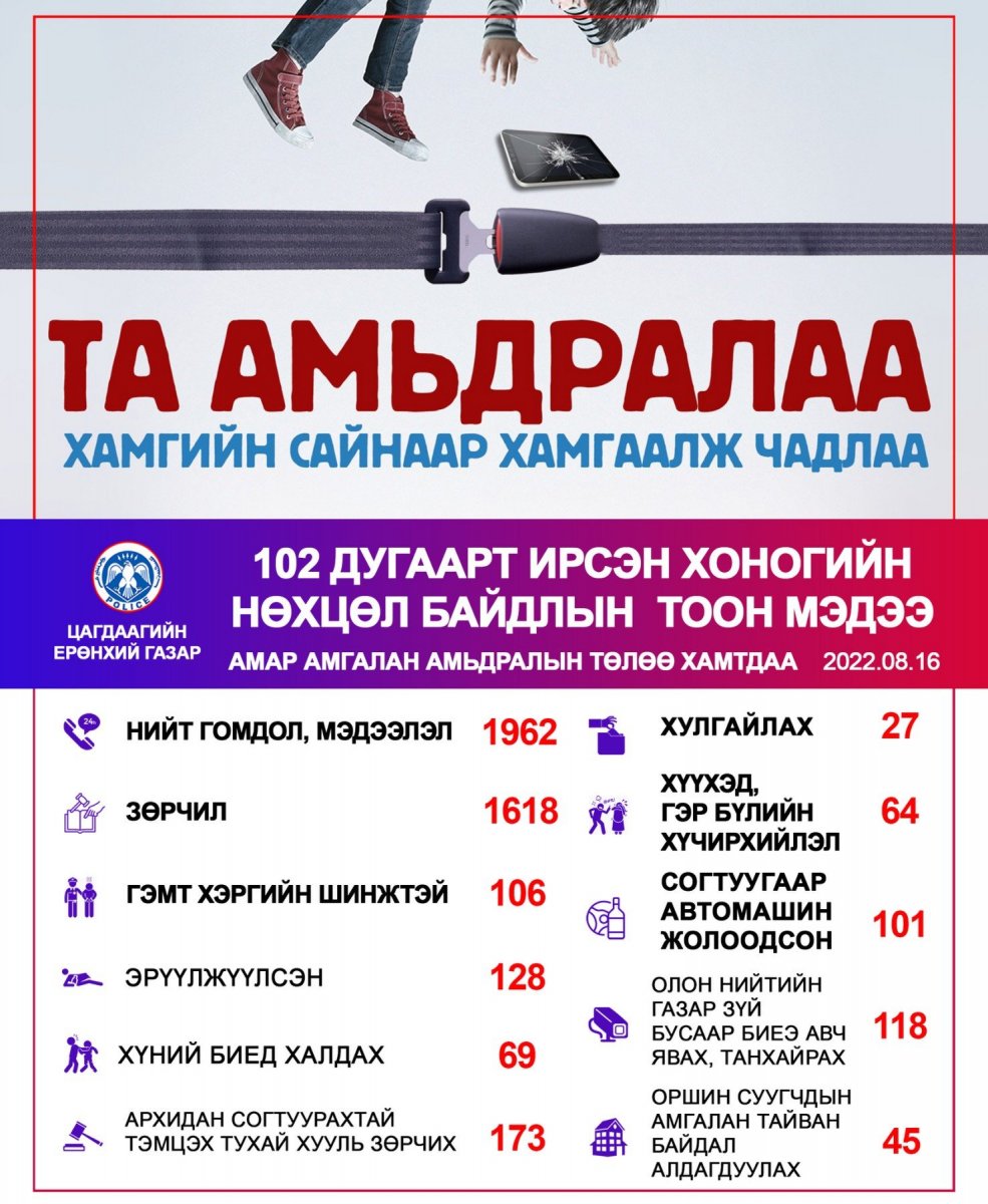 Энэ сарын 16-нд буюу өчигдөр цагдаагийн байгууллагын 102 дугаарын утсанд нийт 1962 гомдол мэдээлэл бүртгэгджээ. Үүнээс зөрчлийн дуудлага мэдээлэл 1618, хулгайтай холбоотой 27, хүүхэд, гэр бүлийн хүчирхийллийн дуудлага 64, гэмт хэргийн шинжтэй 106 мэдээлэл бүртгэгдсэн байна.