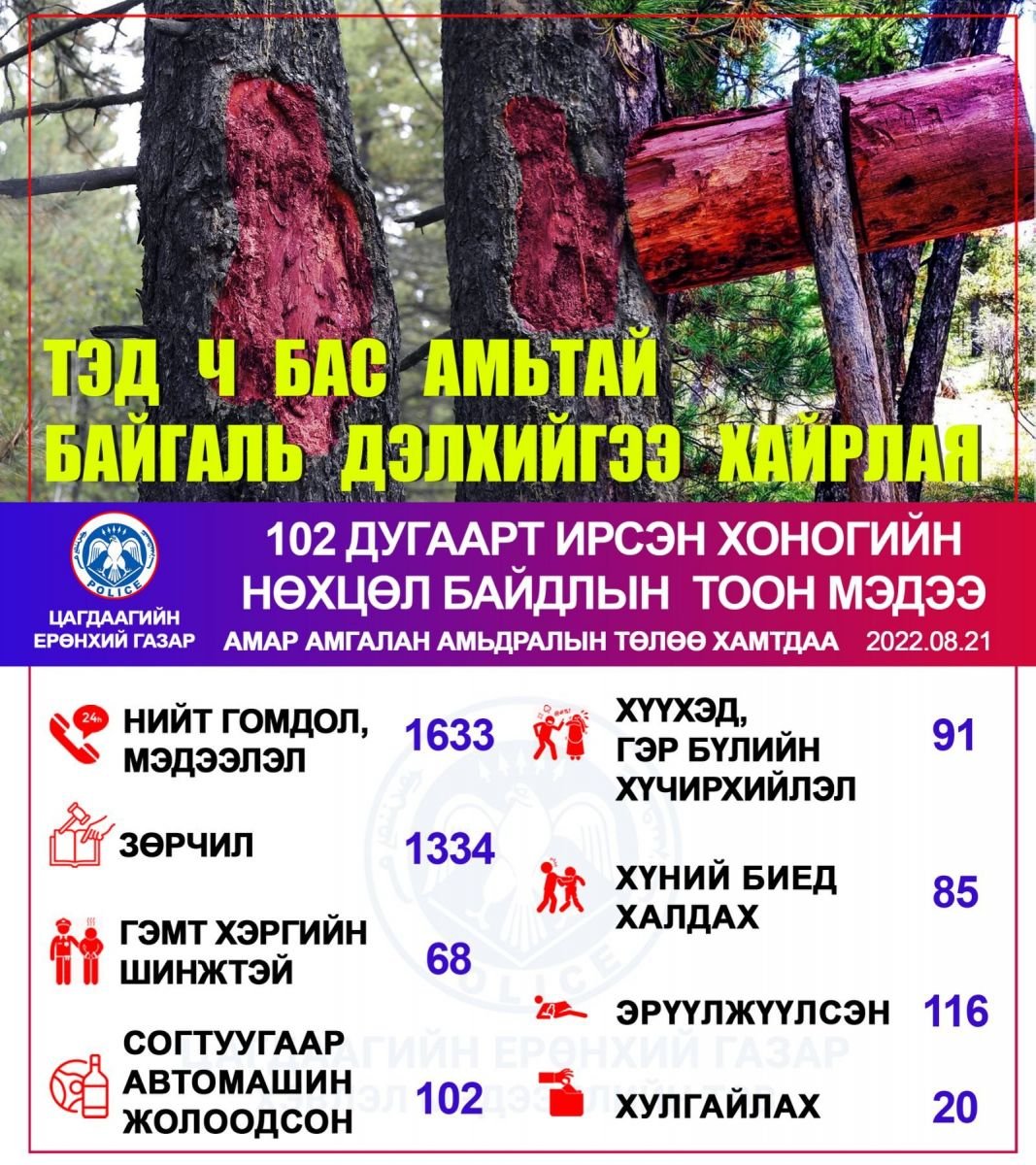 Цагдаагийн байгууллагын 102 тусгай дугаарт өнгөрсөн хоногт нийт 1633 дуудлага, мэдээлэл бүртгэгджээ. Үүнээс зөрчлийн шинжтэй 1334, гэмт хэргийн шинжтэй 68 дуудлага, мэдээлэл байна.