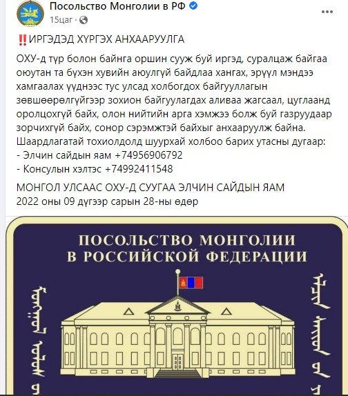 Ойрын өдрүүдэд ОХУ-ын зарим хотуудад албан бус жагсаал, цуглаан болох тухай мэдээлэл нийгмийн сүлжээгээр тархаж байгаатай холбогдуулан Монгол улсаас ОХУ-д суугаа элчин сайдын яамнаас дараах мэдэгдлийг гаргажээ.