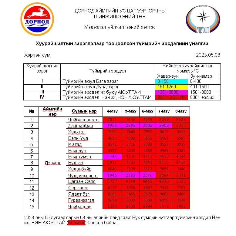 - Аймгийн Ус цаг уур орчны шинжилгээний төвийн хуурайшилтын зэрэглэлээр тооцоолсон түймрийн эрсдэлийн үнэлгээгээр бүх сум нэн аюултай түвшинд хүрсэн тул аймгийн хэмжээнд Гамшгаас хамгаалах өндөржүүлсэн бэлэн байдлын зэрэгт шилжүүлэх.