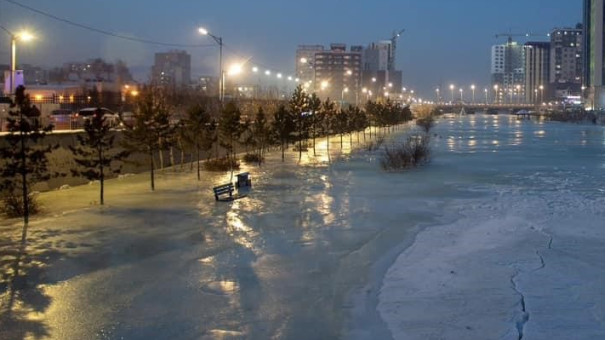 Байгалийн мөсөн гулгуурын талбай буюу каток үүсчихсэн байна. Хүүхдүүд конькигээ углаад гулсаад байж болно. Юүн бохир ус. Кх!