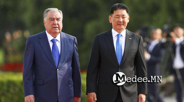 Монгол Улсын Ерөнхийлөгч У.Хүрэлсүх, Тажикистан Улсын Ерөнхийлөгч Эмомали Рахмон нар Төрийн хүндэт харуулын цэргүүд болон хоёр талын албан ёсны төлөөлөгчидтэй мэндчилж, дурсгалын зураг авахууллаа.