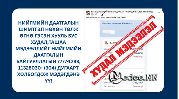 Сүүлийн үед фэйсбүүк болон бусад сошиал сувгаар “Нийгмийн даатгалын шимтгэл нөхөн төлж өгнө”, “Нийгмийн даатгалын шимтгэл төлсөн гэх мэдээллийг цахимд шивж оруулж өгнө” гэсэн хууль бус, худал мэдээлэл гаргаж, иргэдийг залилах хүн олширчээ.