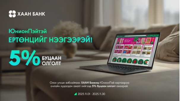 Хэрвээ та ХААН Банканд ЮнионПэй карт эзэмшдэг бол наашаа анхаарлаа хандуулаарай. Эрхэм харилцагч та бүхэн 2025 оны 11-р сарын 1-30-ны хооронд Монгол Улс болон БНХАУ-аас бусад улсын онлайн худалдааны вэбсайтаас худалдан авалт хийх бүрдээ үнийн дүнгийнхээ 5%-ийг буцаан авах боломжтой боллоо.