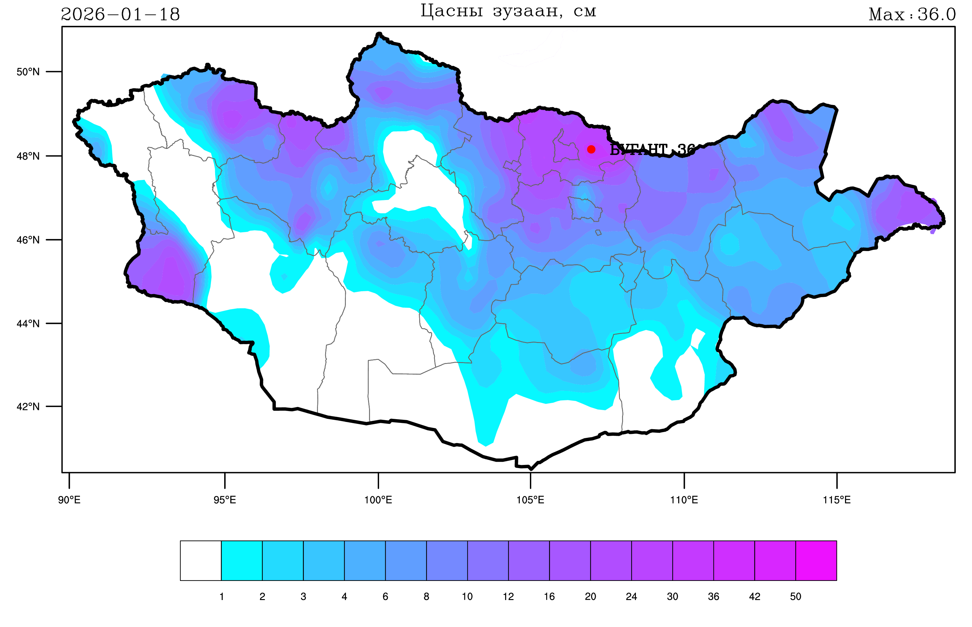 асны зузаан: Өнөө өглөөний 08 цагийн станц харуулуудын мэдээгээр нийт нутгийн 80 хувьд нь цасан бүрхүүл тогтсоноос хамгийн их нь Сэлэнгийн Бугантад 36.0 см, Зэлтэрт 29.0 см, Орхонд 26.0 см, Зүүнбүрэнд 25.0 см, Увсын Хяргас 28.0 см, Ховдын Үенч, Алтай, Завханы Тэс, Увсын Малчин, Сэлэнгийн Хүдэр, Ерөө, Хушаат, Баянгол, Дархан-Уулын Шарын гол, Дархан, Орхон, Хонгор, Төв аймгийн Угтаалцайдамд 20.0-24.0 см, бусад нутгаар 1.0-18.0 см цасан бүрхүүлтэй байна.