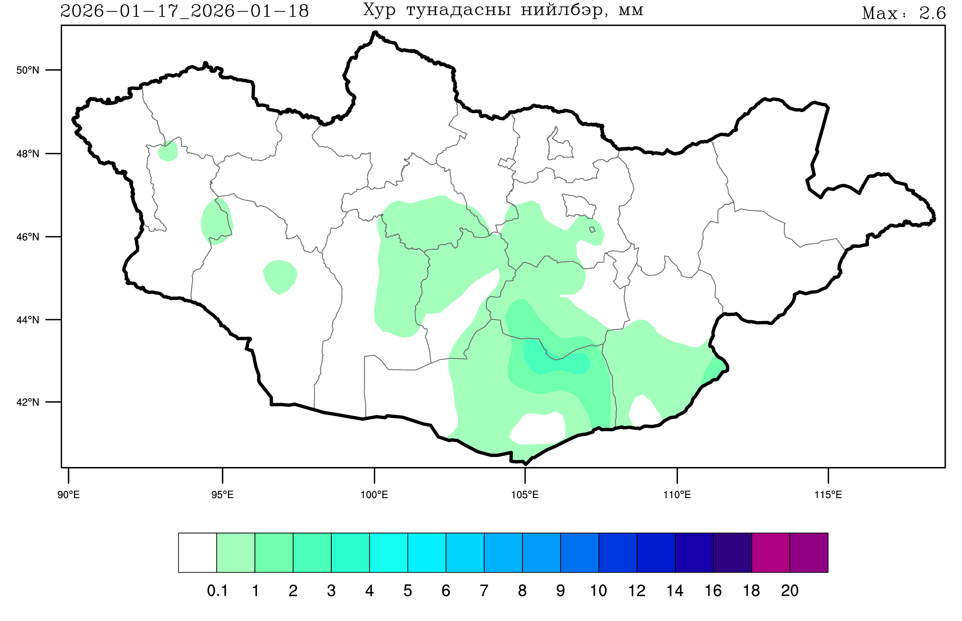 Хур тунадас: Өнгөрсөн хоногт төвийн аймгуудын нутгийн баруун өмнөд, говийн аймгуудын ихэнх хэсгээр 0.0-2.6 мм цас орсон байна.