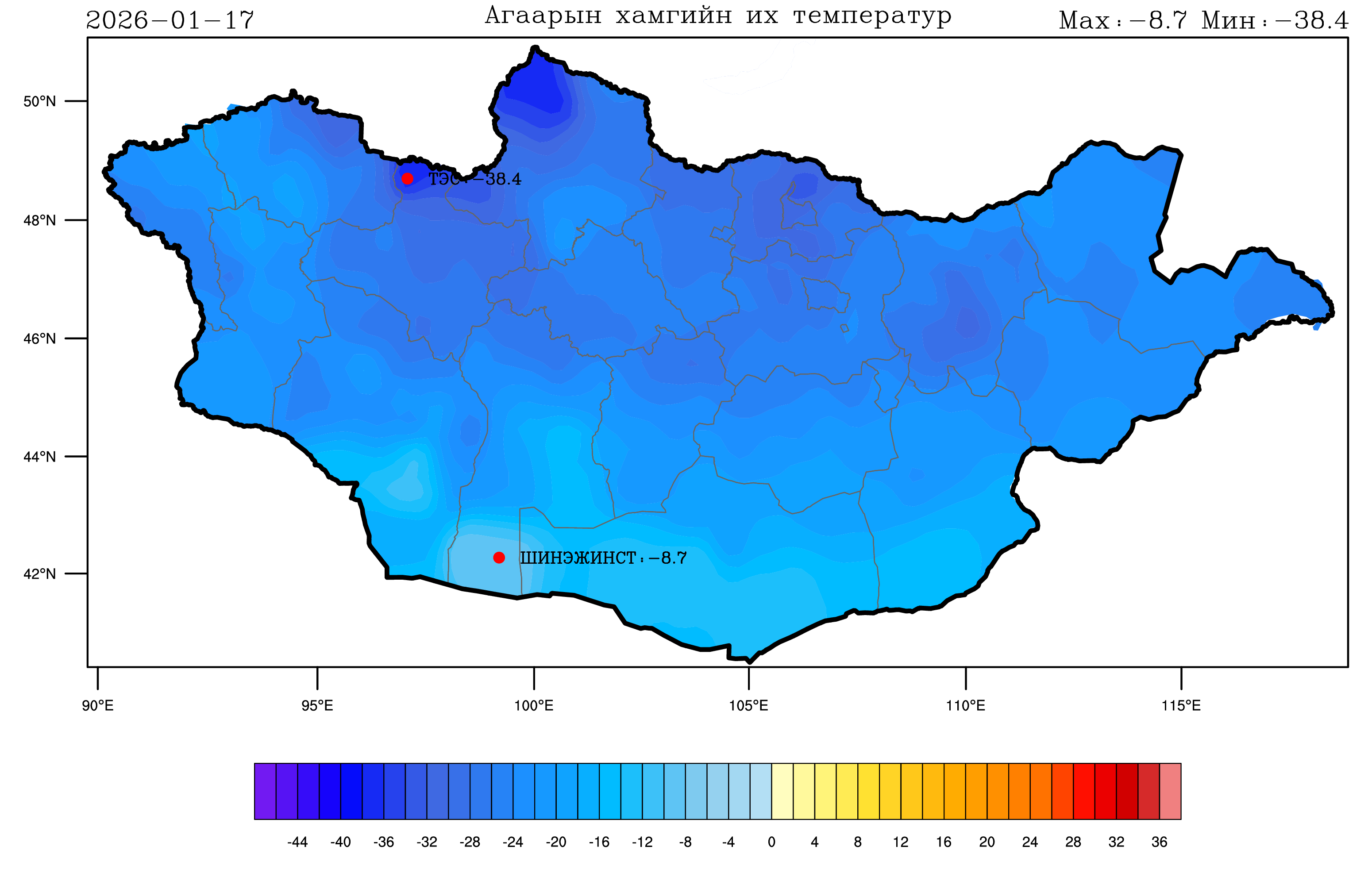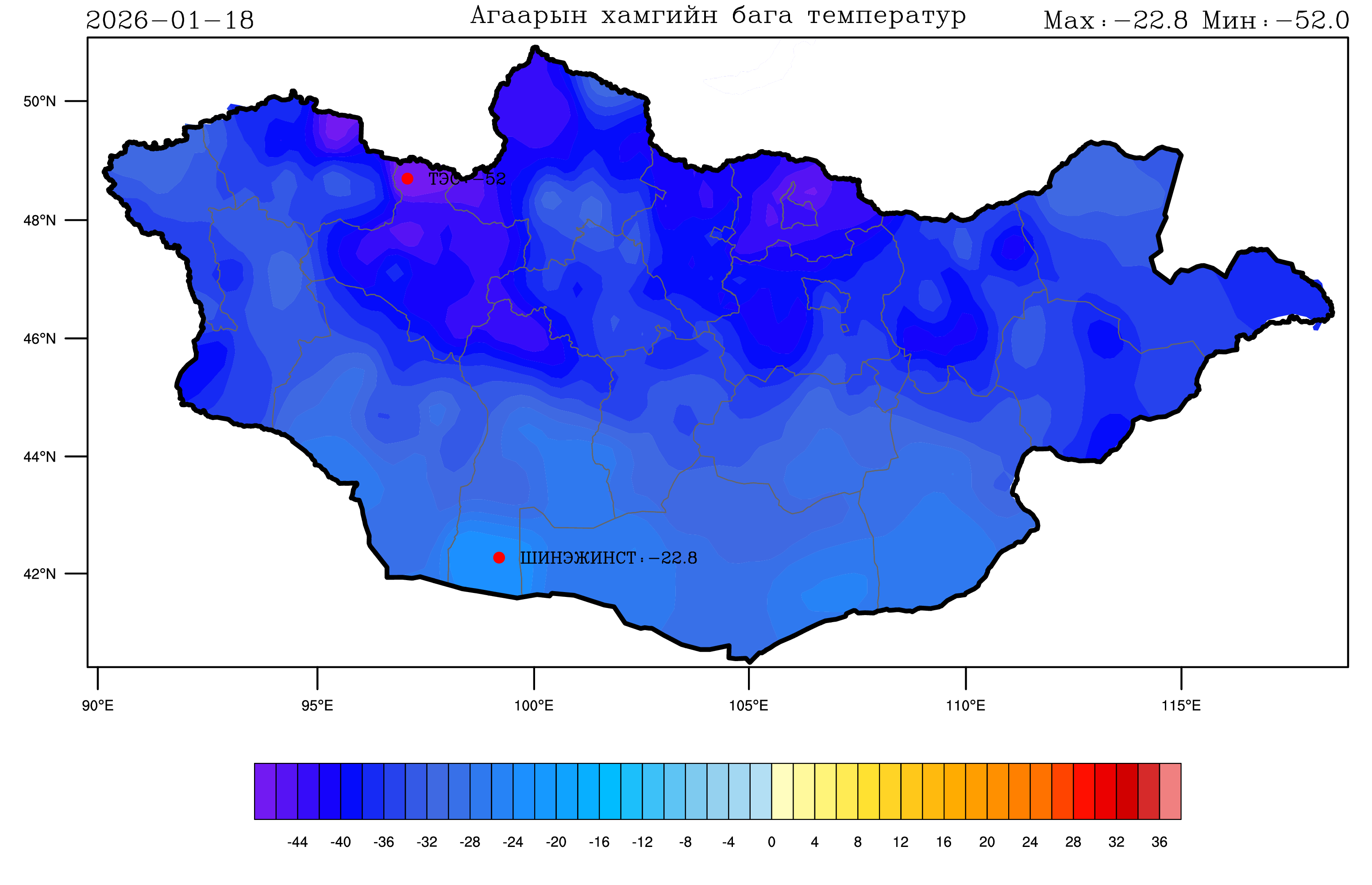 Хамгийн бага температур: Өнгөрсөн шөнө ихэнх нутгаар 4-10 градусаар хүйтний эрч чангарч Идэр, Тэс, Ерөө голын хөндийгөөр -47...-52 градус, Увс нуурын болон Дархадын хотгор, Хангайн уулархаг нутаг, Байдраг, Завхан голын эх, Эг, Үүр, Орхон, Сэлэнгэ, Хараа, Туул, Хэрлэн голын хөндийгөөр -41...-46 градус, говийн бүс нутгийн өмнөд хэсгээр -23...-28 градус, бусад нутгаар -31...-36 градус хүйтэн хоносон байна.