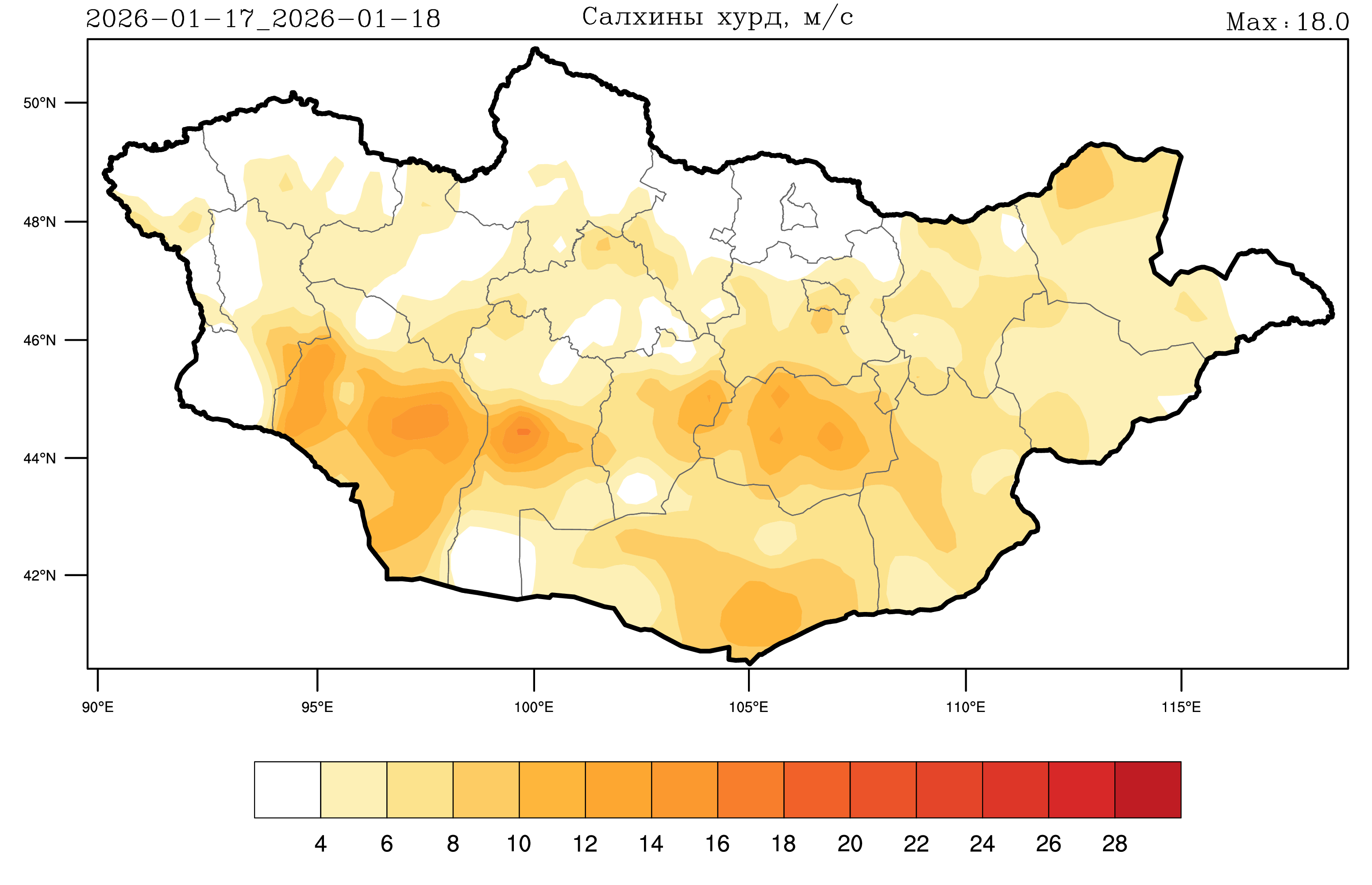 Салхи: Нутгийн хойд хэсгээр секундэд 3-8 метр, нутгийн өмнөд хэсгээр секундэд 7-12 метр, Алтайн уулархаг нутаг, говь, талын нутгаар секундэд 15-17 метр хүрч ширүүсэв.