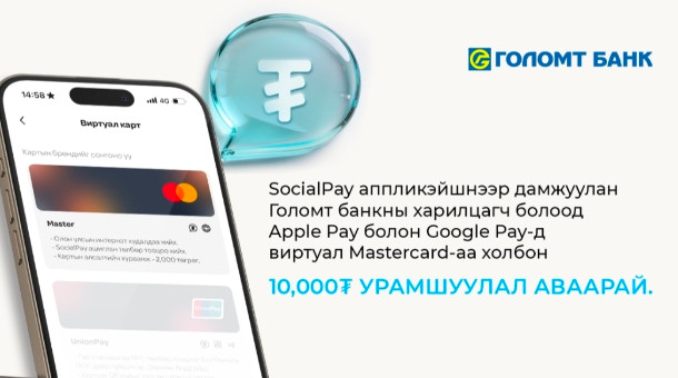 Урамшууллын хүрээнд дээрх төлбөрийн хэрэгслүүдэд Голомт банкны Mastercard брэндийн виртуал картаа шинээр холбосон харилцагчдад 10,000₮-ийн мөнгөн урамшуулал олгох юм. Хараахан Mastercard виртуал карт захиалж амжаагүй хүмүүс SocialPay аппликэйшний “Хэтэвч” цэсээр дамжуулан виртуал картаа идэвхжүүлэх боломжтой.