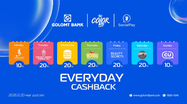 Хүүхэд, залуус аа, санхүүгийн зөв хэрэглээнд суралцахад тань туслах The Color Card, Skate card эсвэл SocialPay Junior аппликэйшнийг хэрэглэдэг үү? Хэрвээ тийм бол Голомт банкнаас хэрэгжүүлж буй “Everyday cashback” урамшуулалт аяны хүрээнд дээрх бүтээгдэхүүн, үйлчилгээг ашиглаад өдөр бүр 20% хүртэлх буцаан олголт авах боломжтой.