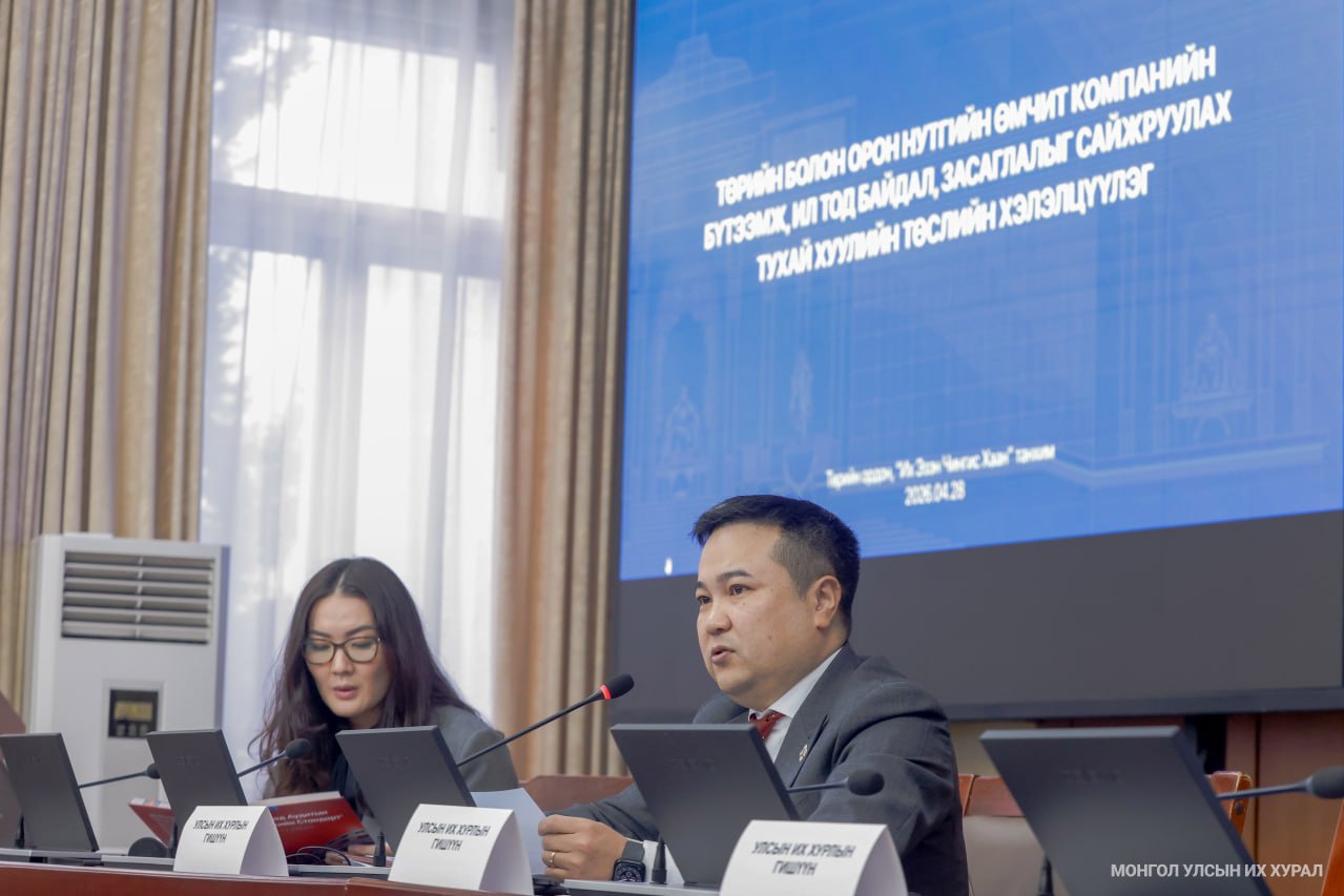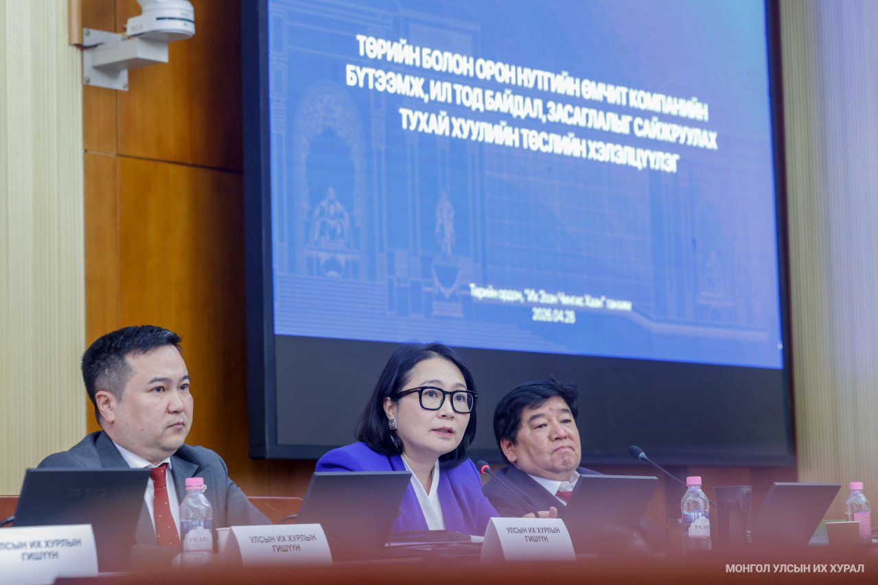 Улсын Их Хурлын Эдийн засгийн байнгын хороо, Улсын Их Хурлын даргын 2025 оны 529 дүгээр захирамжаар байгуулагдсан ажлын хэсэг өнөөдөр (2026.04.28) Төрийн болон орон нутгийн өмчит компанийн бүтээмж, ил тод байдал, засаглалыг сайжруулах тухай хуулийн төслийн хэлэлцүүлгийг Төрийн ордны "Их Эзэн Чингис хаан" танхимд зохион байгууллаа.