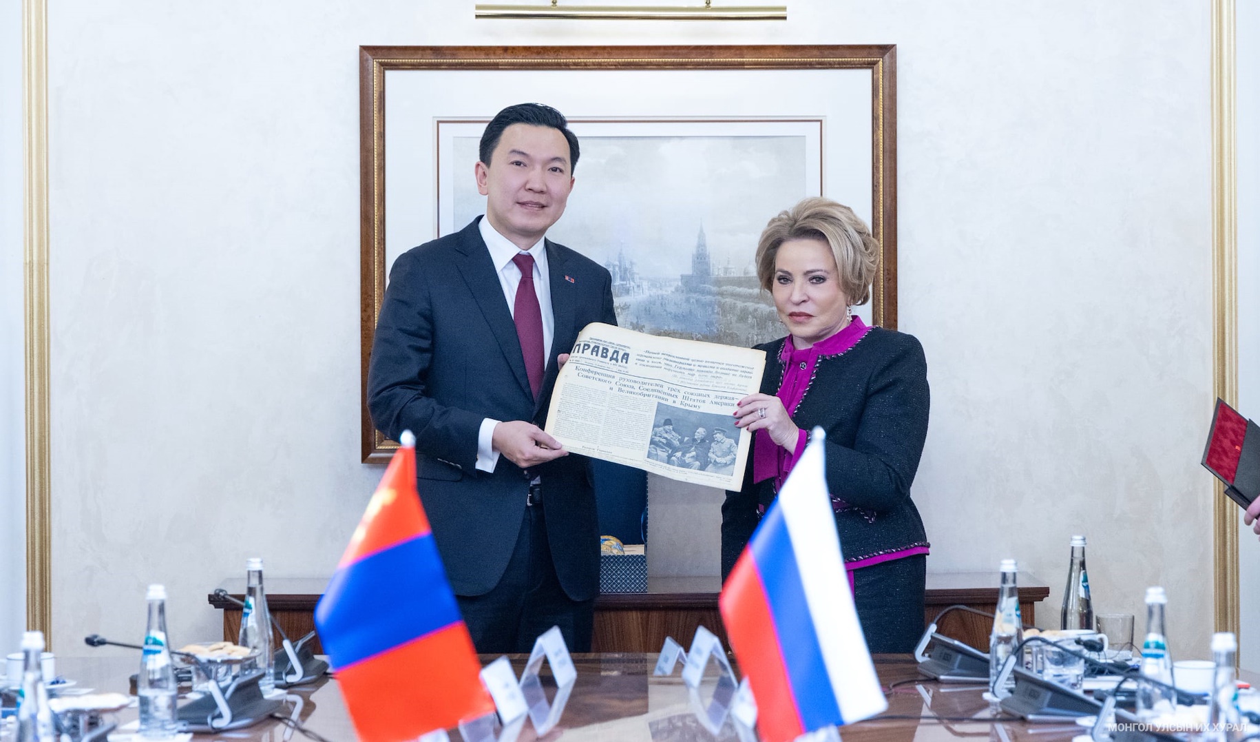 ОХУ-ын Холбооны Хурлын Холбооны Зөвлөлийн дарга В.И.Матвиенко Монгол Улс нь ОХУ-ын Ази, Номхон далайн бүс нутаг дахь чухал түнш бөгөөд хоёр орны найрсаг харилцаа, хамтын ажиллагааны өнө эртний уламжлалыг өргөжүүлэн хөгжүүлэхэд парламент хоорондын хэлхээ, холбоо чухал үүрэгтэйг тэмдэглэлээ. Тэрбээр, Улсын Их Хурлын дарга Н.Учрал “Монгол Улсын тусгаар тогтнол, бүрэн эрхт байдлын төлөөх тэмцэл: 1924-1945 он” сэдвээр докторын зэргээ хамгаалсныг дурдаад өдгөөгөөс 81 жилийн өмнө Монгол Улсын тусгаар тогтнолыг олон улсад баталгаажуулсан Ялтын гэрээг баталсан түүхт энэ өдөр уулзаж буйд бэлэгшээж байна гэлээ. Иймд “Их Засаг” сургуулийн үүдэнд баримал болон баригдсан “Гитлерийн Германы эсрэг эвсэл” буюу Рузвельт, Черчилль, Сталин нарын зургийг харуулсан 1945 оны “Правда” сонины эх хувийг дурсгав.