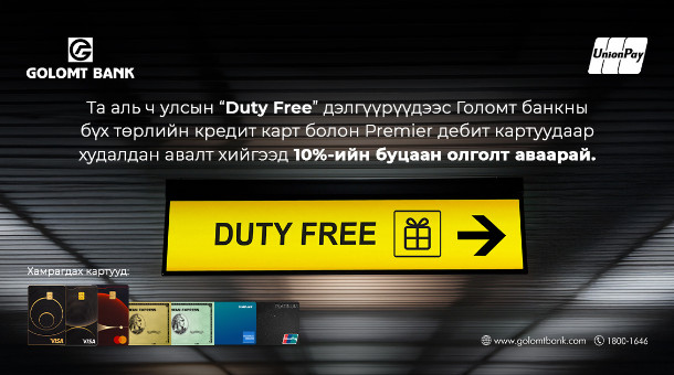 Голомт банкны картаар Duty free дэлгүүрт төлбөрөө төлөөд 10%-ийн буцаан олголт аваарай